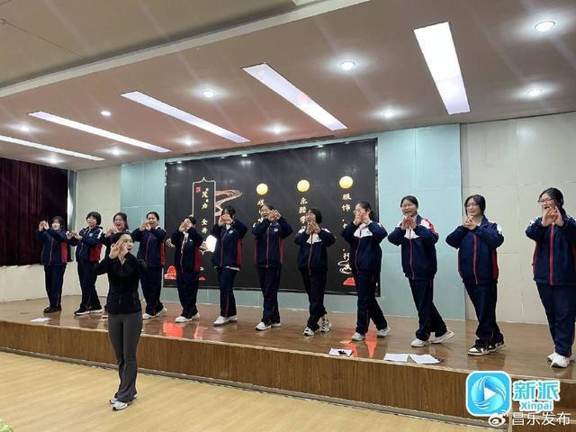 学习环节,他们有的跟团队老师学习唱腔,反复练习戏曲选段;有的向老师请教乐器演奏技巧;还有的专注于了解不同角色所对应的服饰与妆容。在展示环节,同学们积极展现自我,颇有“茂腔小达人”之势。为了让学生们更好地习得技法,刘芸含还利用新体系音乐教育的理念,带大家共同演唱茂腔经典剧目的唱段,同学们在戏曲唱腔的重音、顿音节点以及伴奏的锣镲点中加入跺脚、拍手、拍肩膀的声势,边走边拍手边唱。